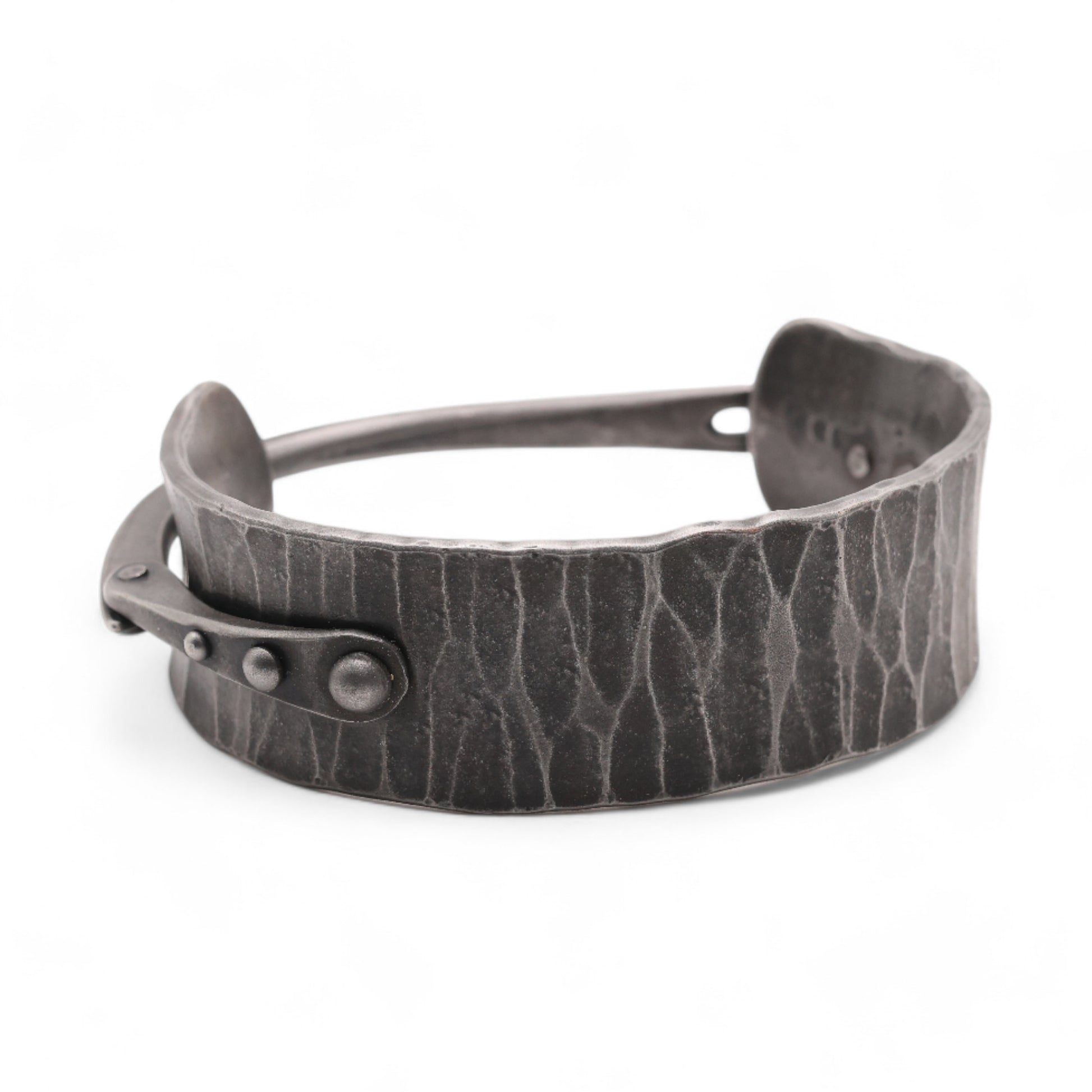 Amazing hand-forged stainless steel Bracelet with a clasp, unique "bark" hand-hammered texture and brushed black patina finish.