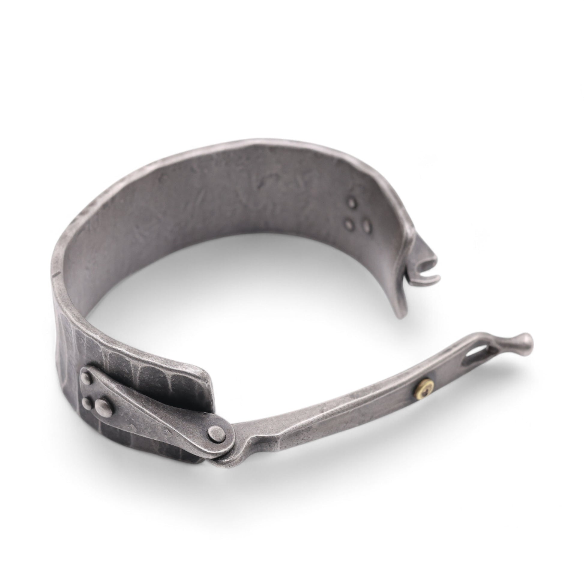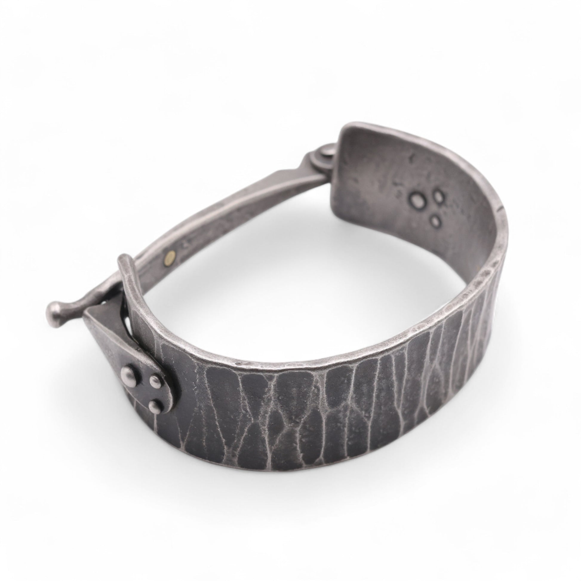 Amazing hand-forged stainless steel Bracelet with a clasp, unique "bark" hand-hammered texture and brushed black patina finish.
