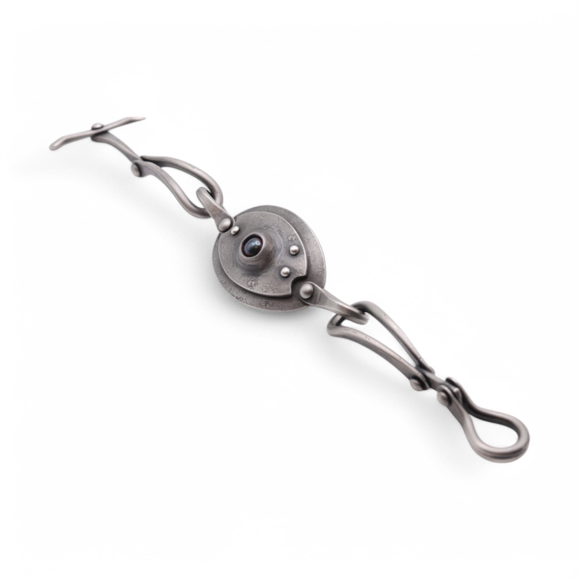 Hand-forged stainless steel Bracelet with an incredible natural black pearl, the signature latch and matte black patina finish.