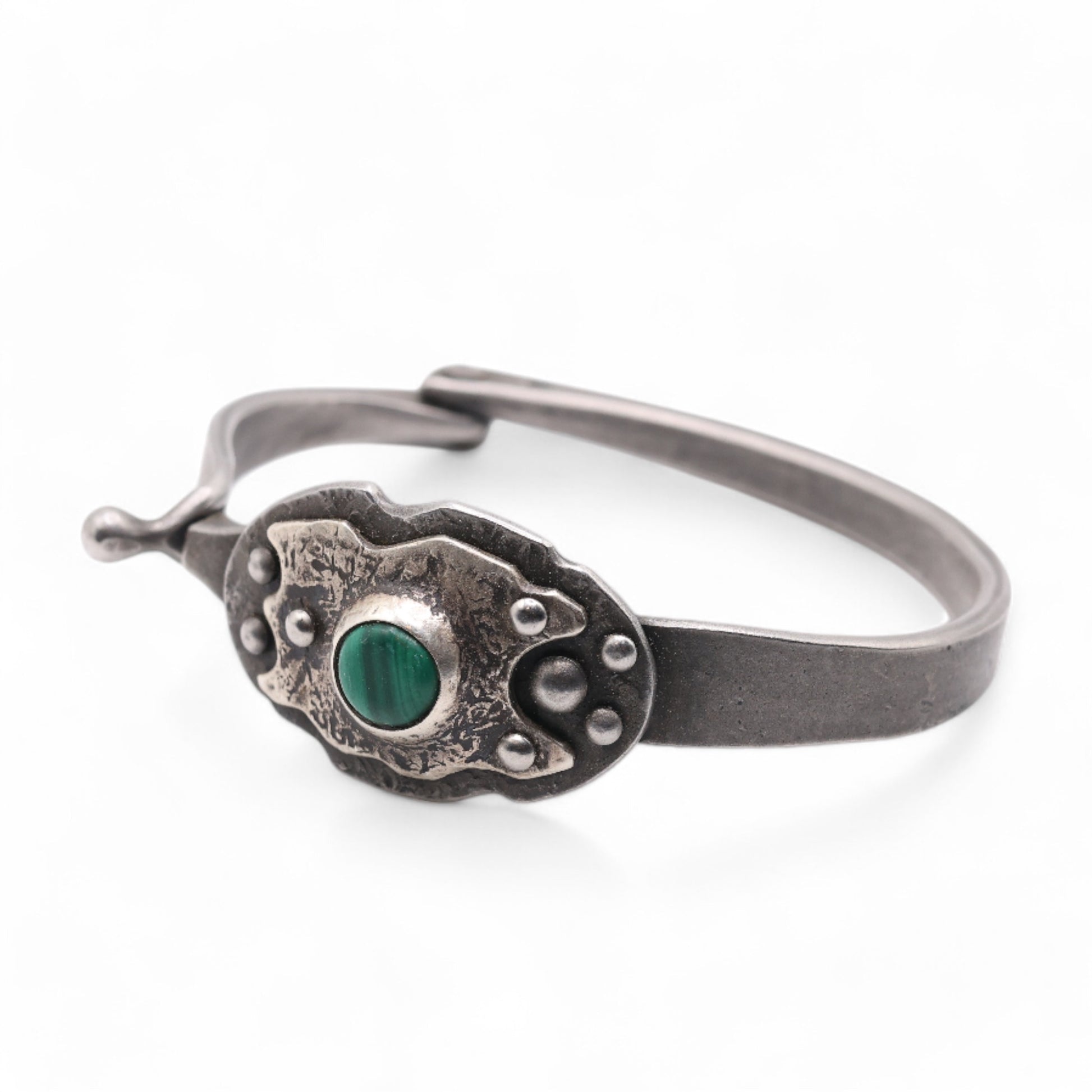 Hand-forged stainless steel Bracelet with a beautiful natural Malachite in a sterling silver bezel, a unique brushed black patina finish and a clasp.