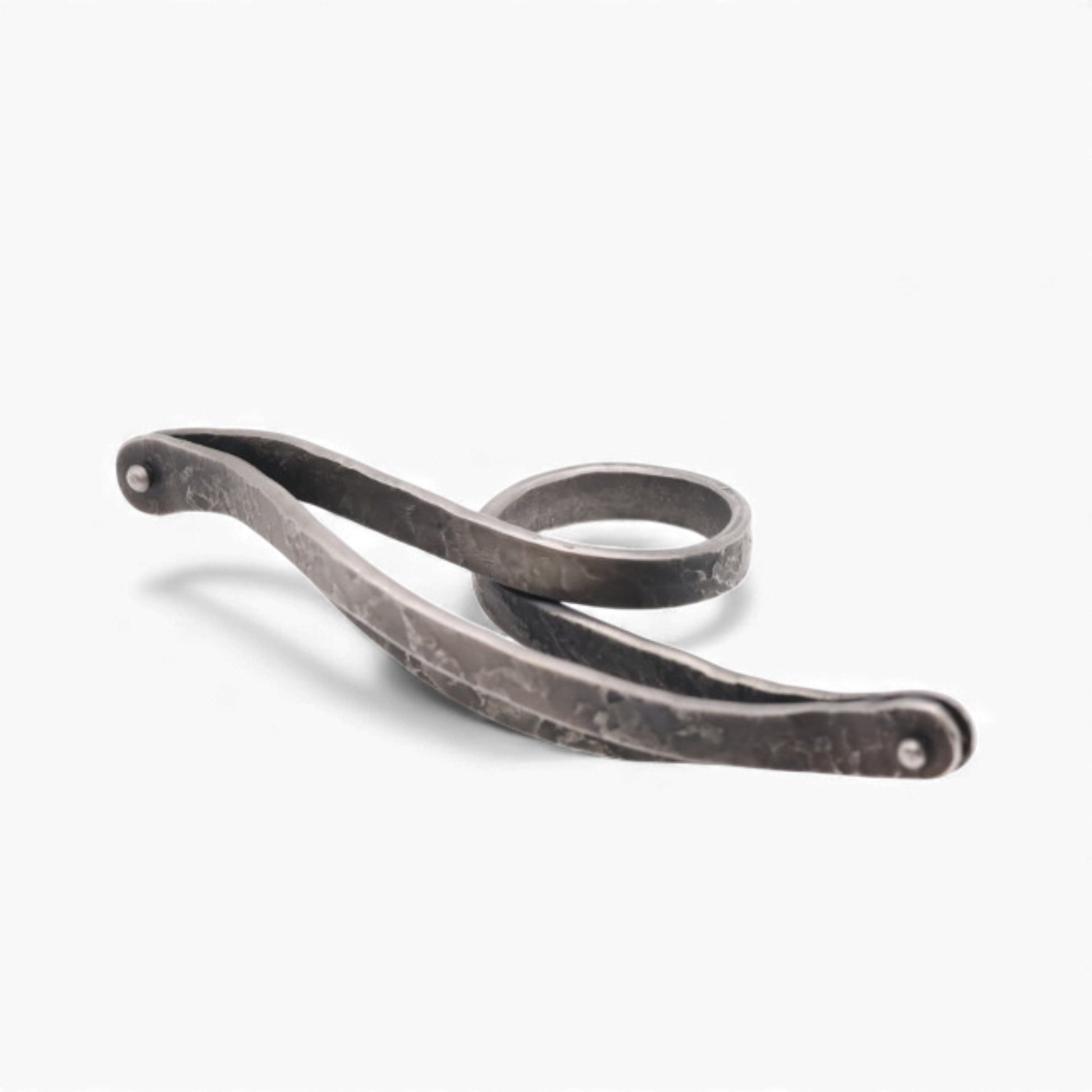 Hand-forged stainless steel ring of he original signature design with rivets, hand-hammered texture and matte dark finish.