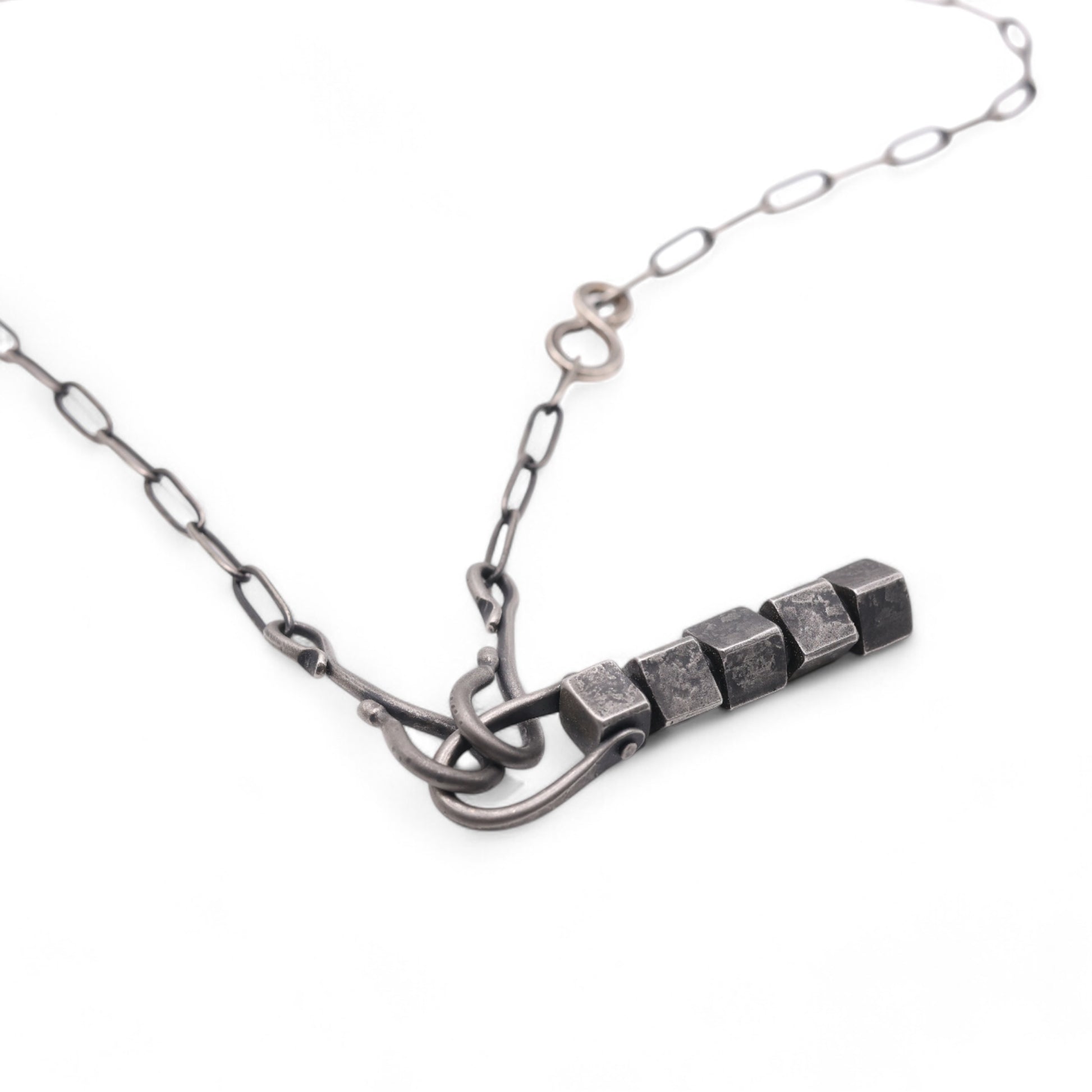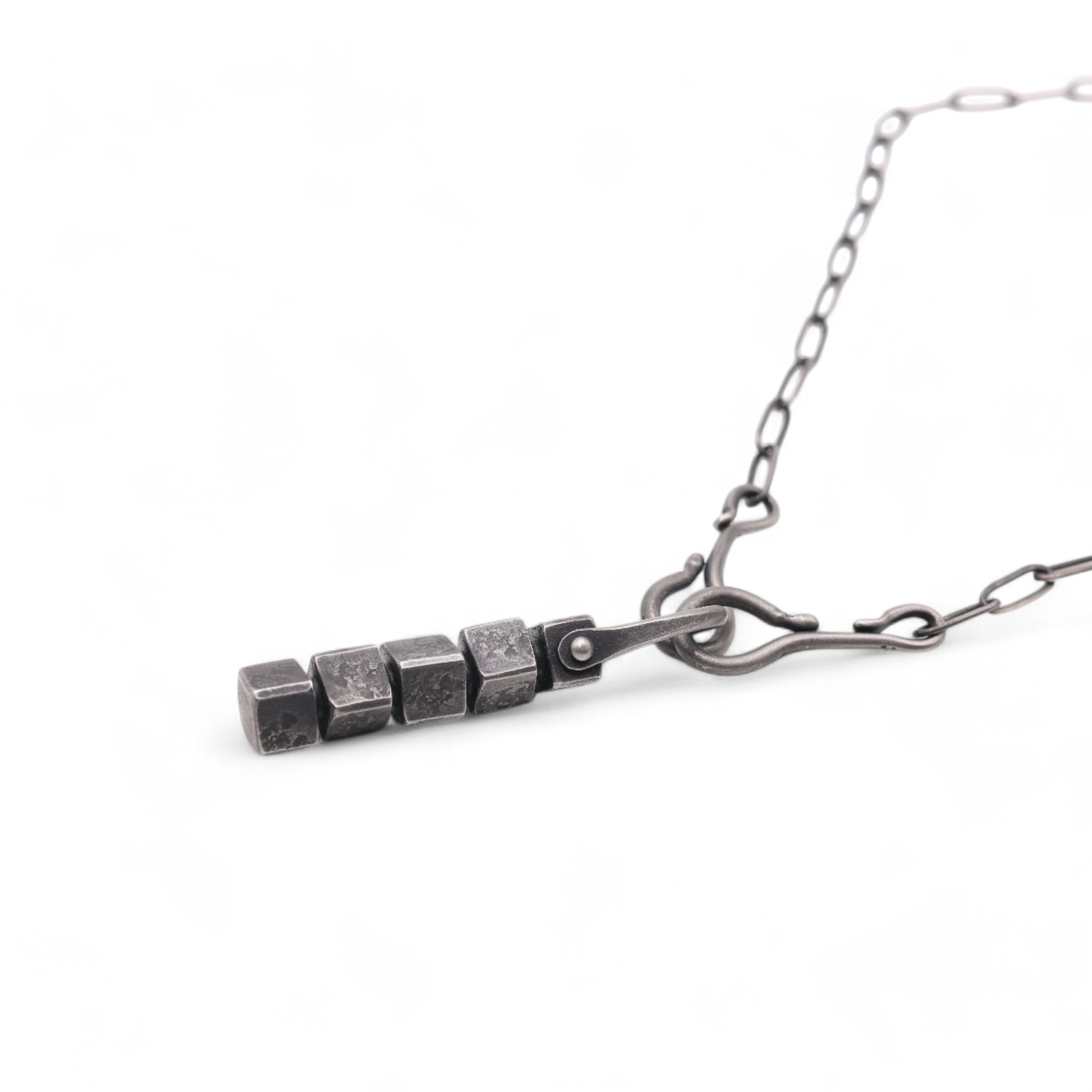 Hand-forged stainless steel "Cubes" Pendant with unique texture and brushed black patina finish. Comes on a stainless steel chain with hand-forged sterling silver hooks.