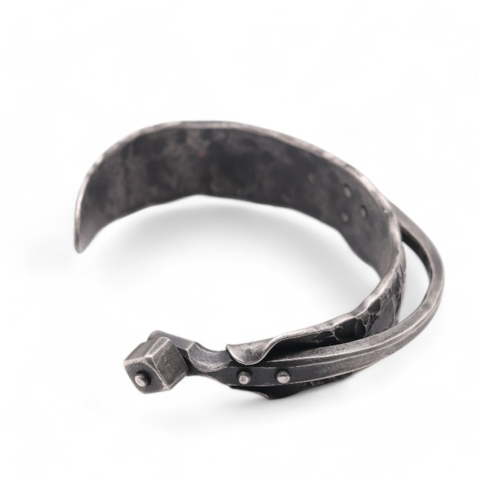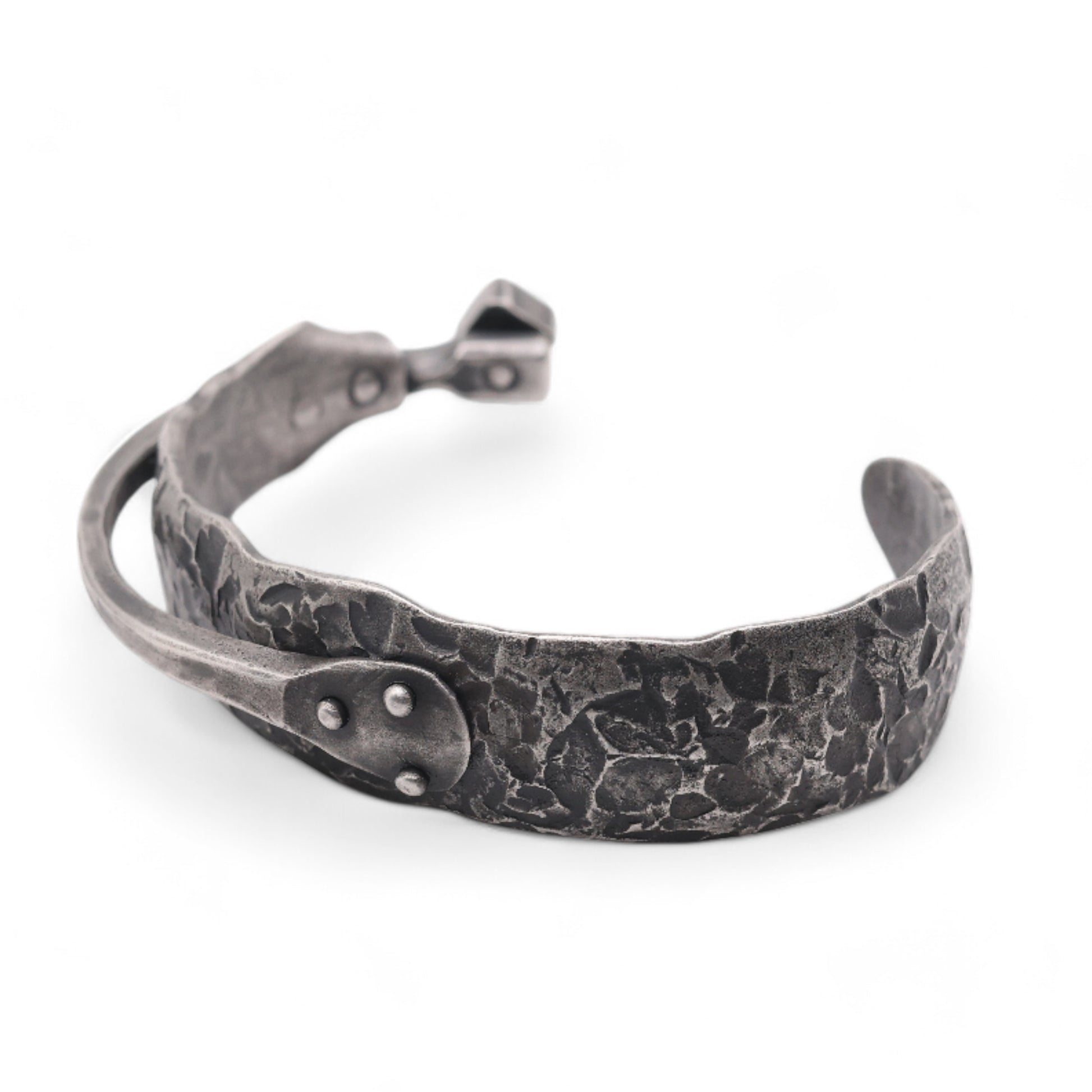 Hand-forged stainless steel "Dragonfly Wing" Bracelet with an iconic hand-hammered texture and brushed black patina finish. From "the Bug" Series.