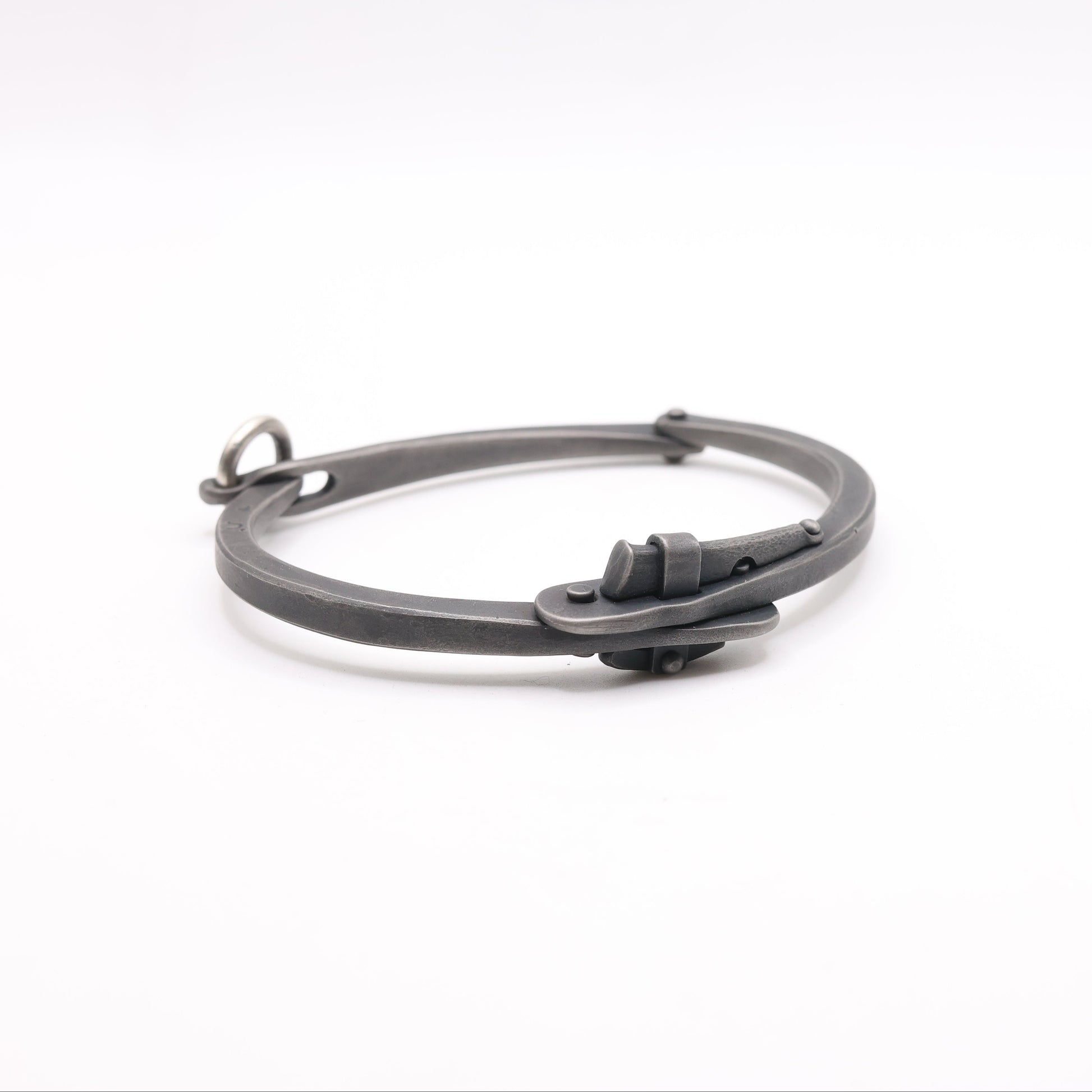 Hand-forged stainless steel Industrial Bracelet with a clasp and brushed black patina finish. The original signature design. Make a statement and elevate your style with this incredible wearable work of art.