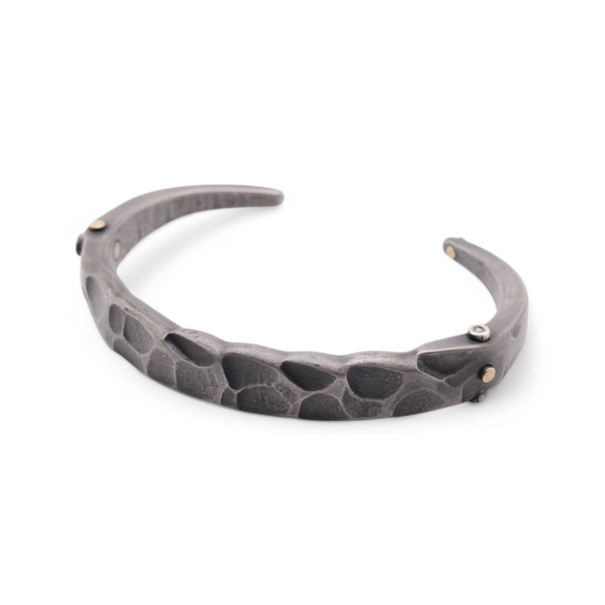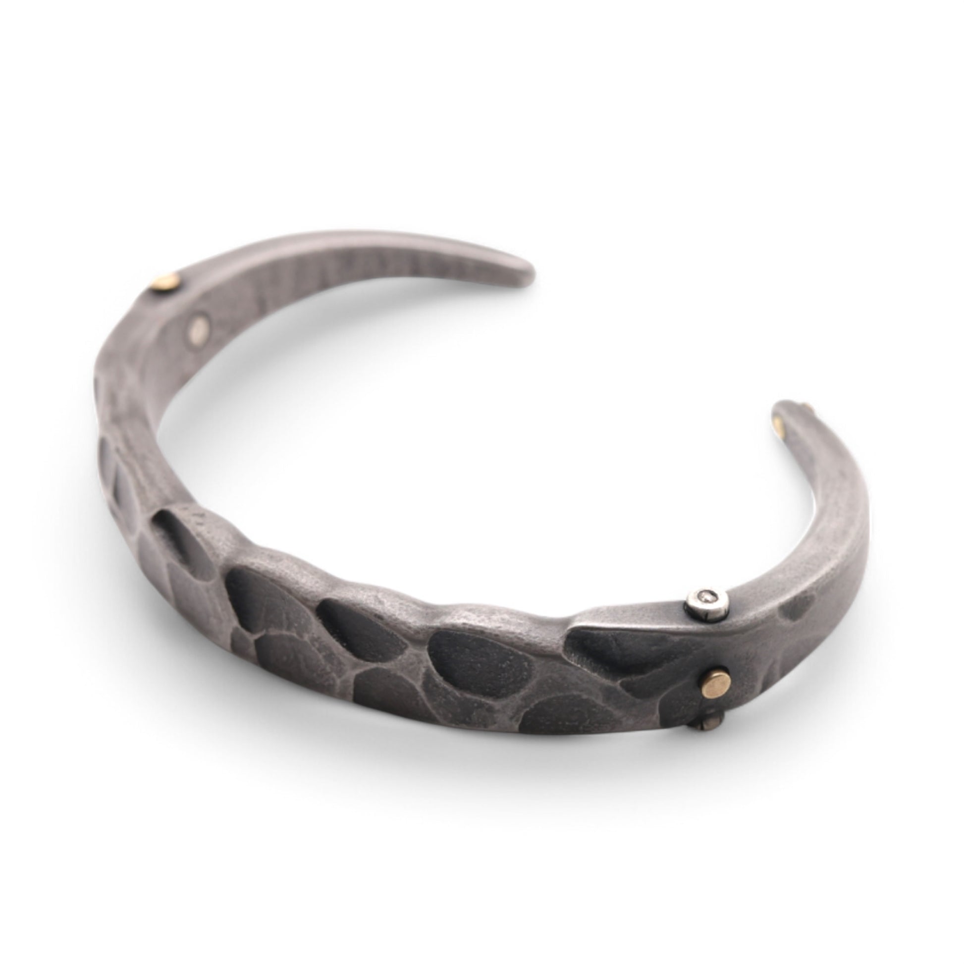 Hand-forged stainless steel Cuff with three sparkling diamonds in sterling silver bezels, the signature special hand-hammered texture and matte black patina finish.